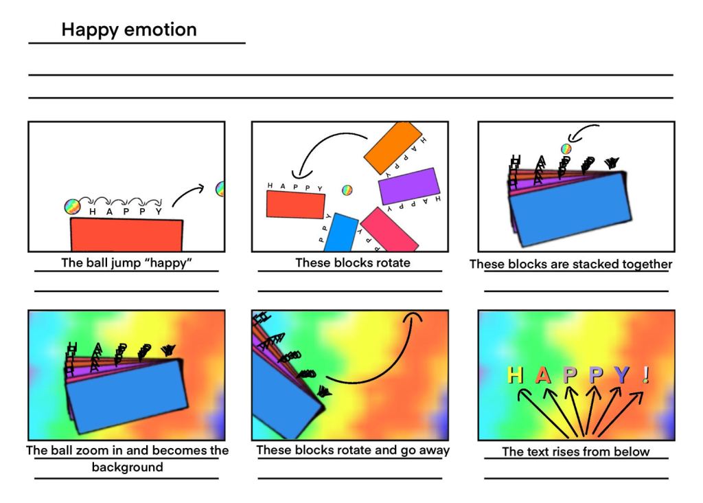 The animation used a lively ball that rotates and jumps to represent happy emotions. There are also several rotating cards in the middle with “Happy” text on them. The animation used many colorful colors, I sped up the movement of the shapes and tried to keep the timing right. Therefore, the most challenging part is